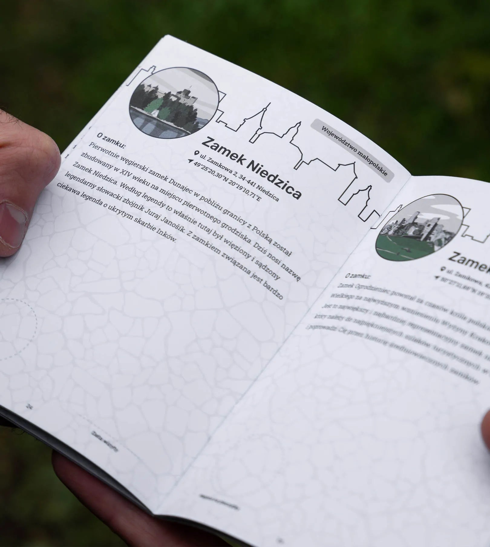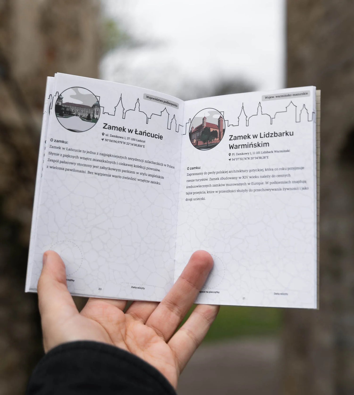 miejsce na dodatkowe pieczątki, oryginalne ilustracje, ciekawostki o każdym zamku lub pałacu