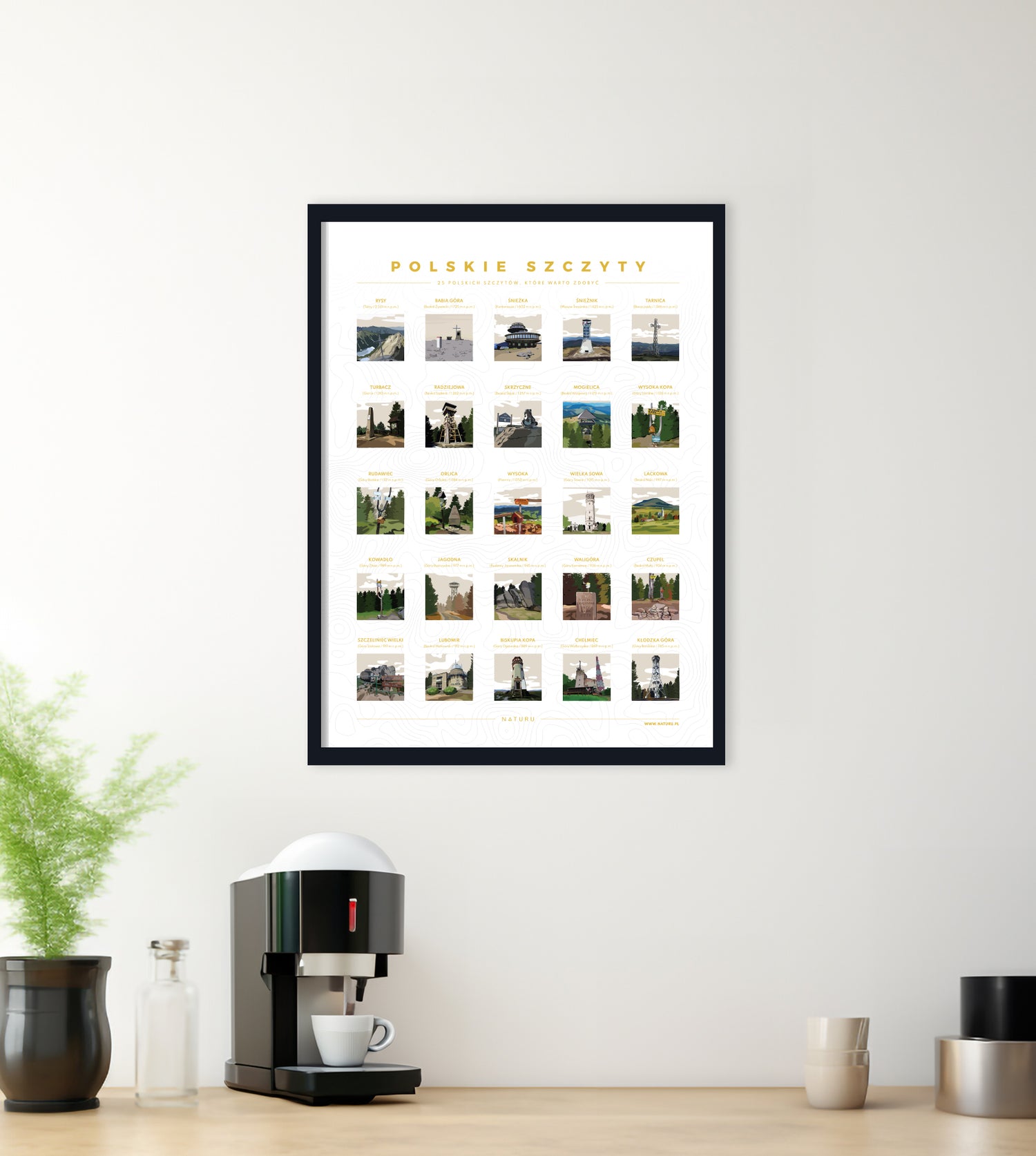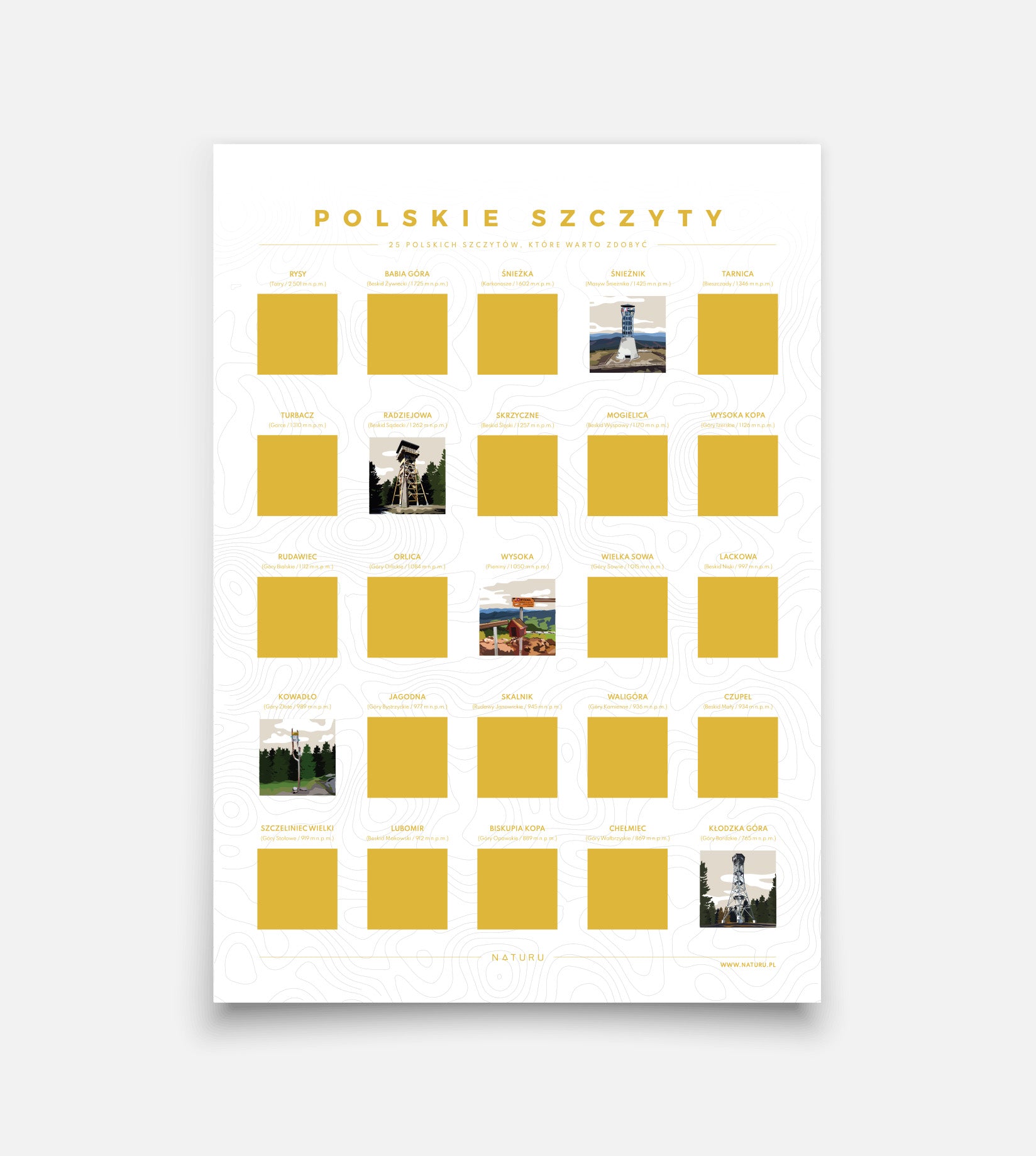 Plakat-zdrapka w formacie A3 sprawi radość każdemu miłośnikowi górskich wędrówek. 25 pól do zdrapania skrywa oryginalne ilustracje, które zabiorą Cię na 25 najpiękniejszych polskich szczytów. Ten plakat-zdrapka to doskonała motywacja oraz lista pomysłów na wycieczki po polskich górach. Wysyłamy go w pudełku z papierem ochronnym, aby dotarł do Ciebie w idealnym stanie, bez najmniejszych uszkodzeń.