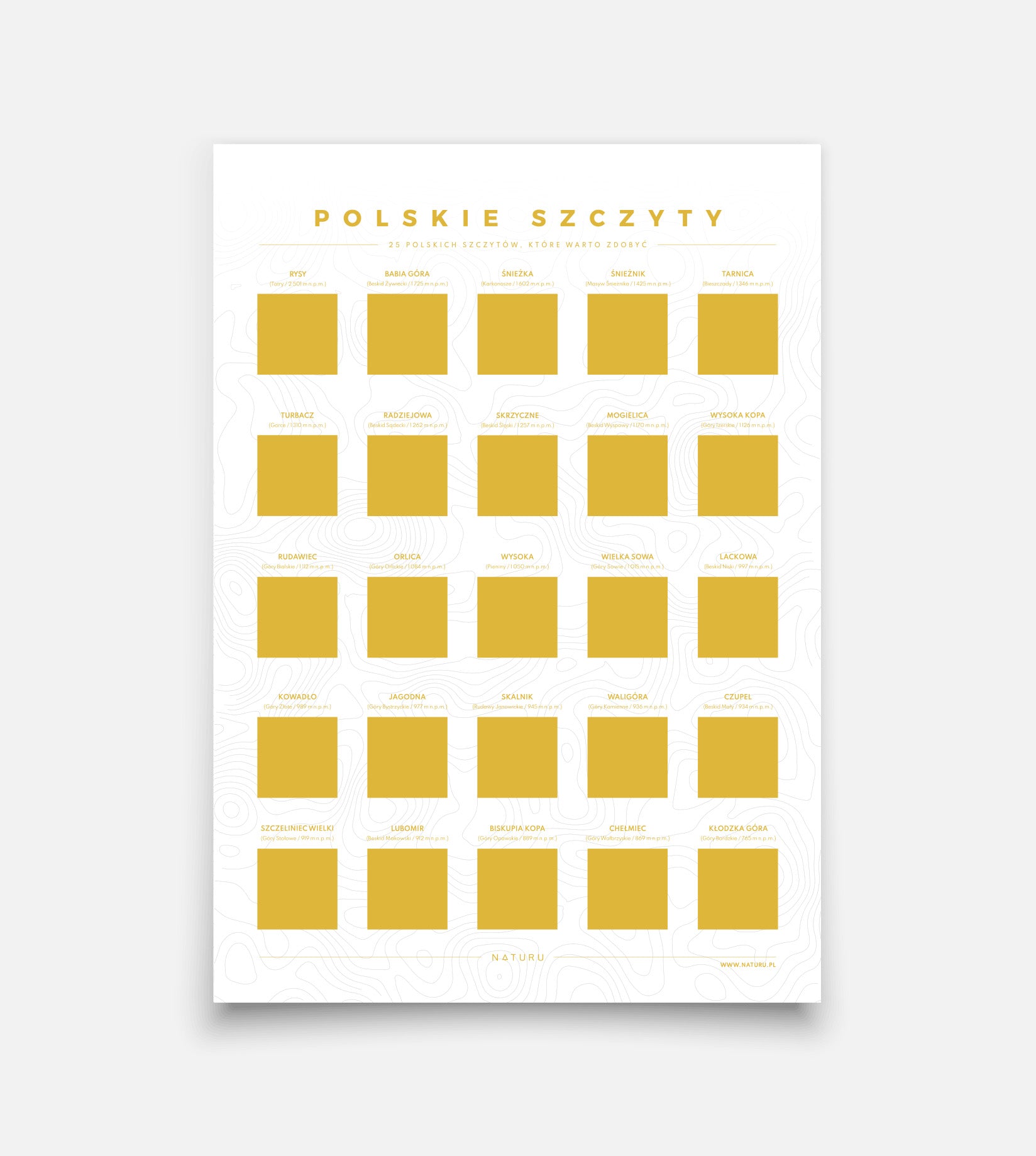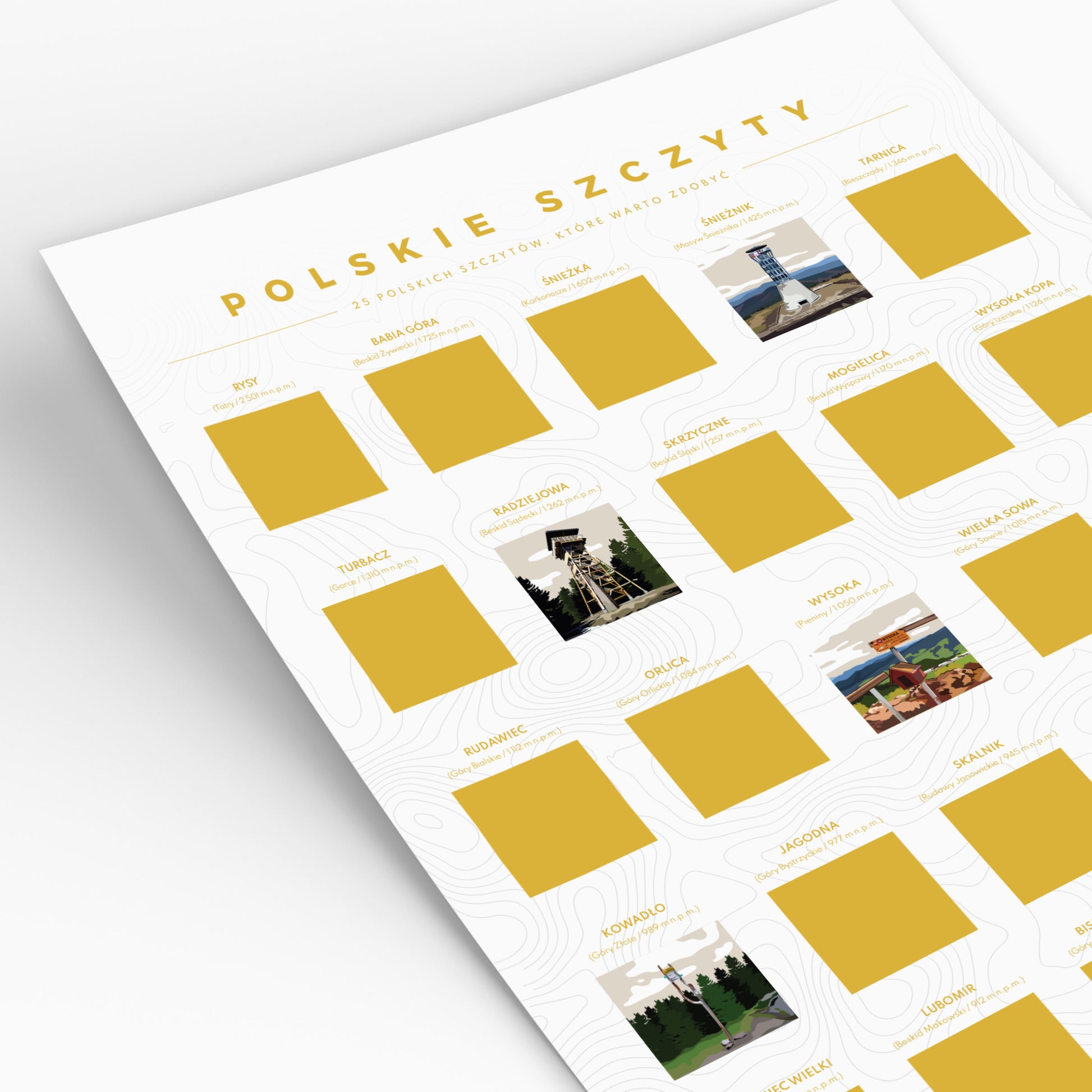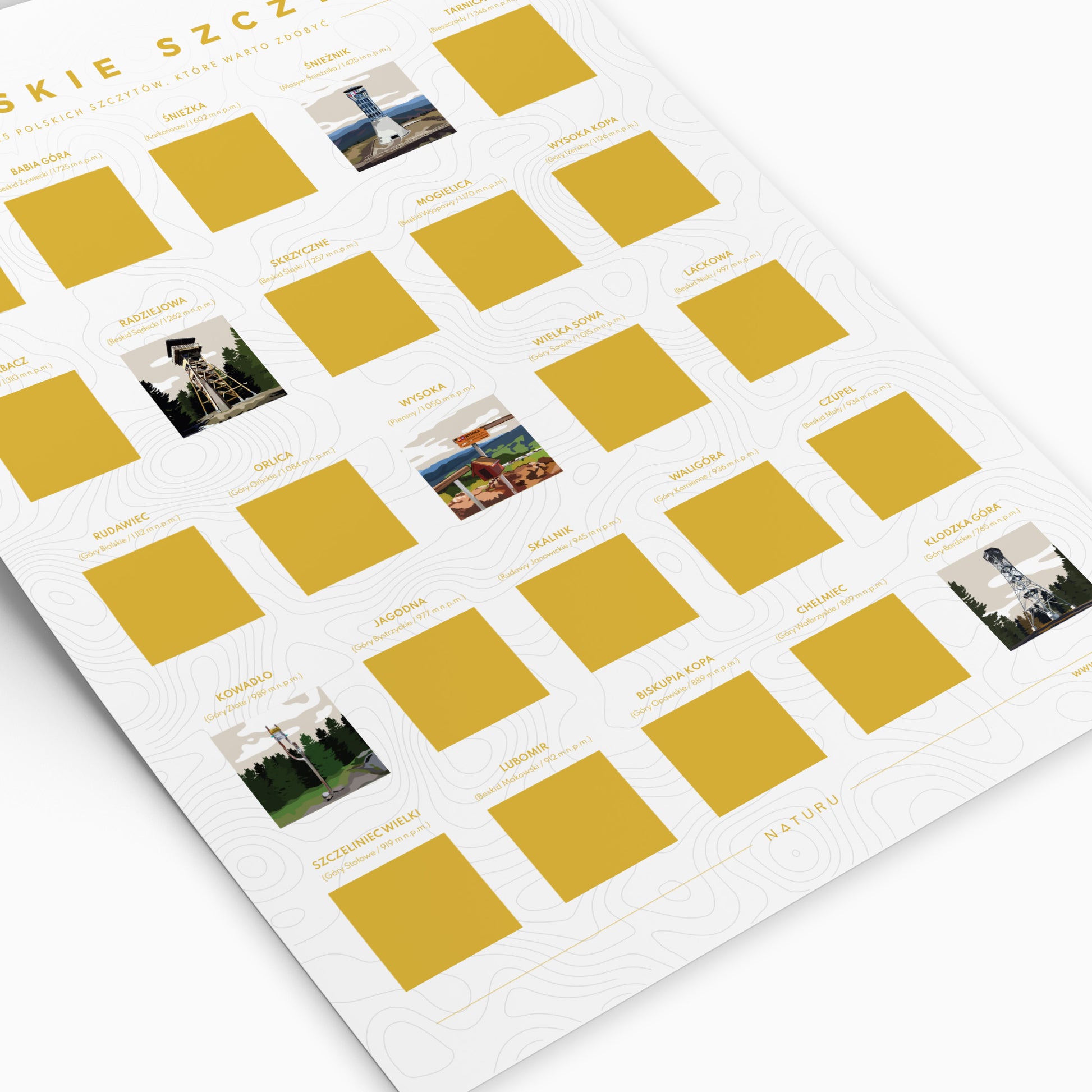 Z plakatem-zdrapką Polskie szczyty pomysły na wycieczki po Polsce same przyjdą Ci do głowy. Pod 25 polami do zdrapania czekają niepowtarzalne ilustracje przedstawiające najsłynniejsze i najchętniej odwiedzane polskie szczyty. Tatry, Karkonosze czy Bieszczady – to tylko część pasm górskich, których wierzchołki ukryliśmy na tym oryginalnym plakacie-zdrapce. Odwiedzaj kolejne miejsca z plakatu i zaznacz swoje osiągnięcia, zdrapując pola – na pamiątkę lub jako sposób na uczczenie kolejnego zdobytego szczytu.